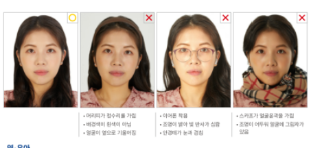 사진 촬영 시에는 모자나 헤어밴드, 안경 등 얼굴을 가리는 액세서리를 착용하지 않아야 합니다. 안경을 꼭 착용해야 하는 경우, 렌즈에 반사가 생기지 않도록 주의해야 하며, 색이 있는 렌즈는 피해야 합니다.