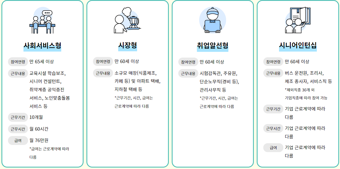 또한 사회서비스형, 시장형, 취업알선형, 시니어인턴십 등의 유형이 있으니, 경력과 경험을 활용하여 일자리를 찾을 수 있습니다.