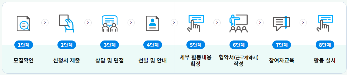 홈피에지, 동 주민센터 게시판, 언론 등을 통해 노인일자리 모집 기관 및 기간을 확인하고 신청서를 제출한 후, 상담 및 면접 과정을 거쳐 선발됩니다.