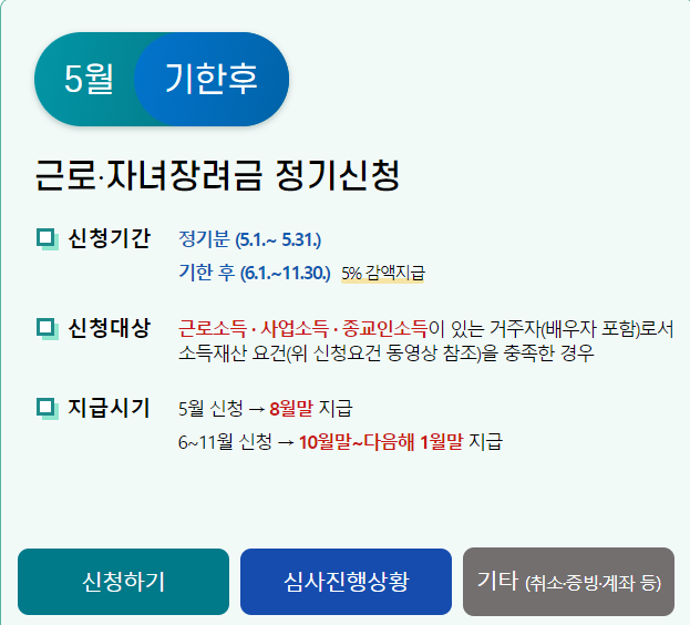 근로장려금 신청 기한은 매년 정해져 있으며, 기한 내에 신청해야만 심사 및 지급이 진행됩니다.