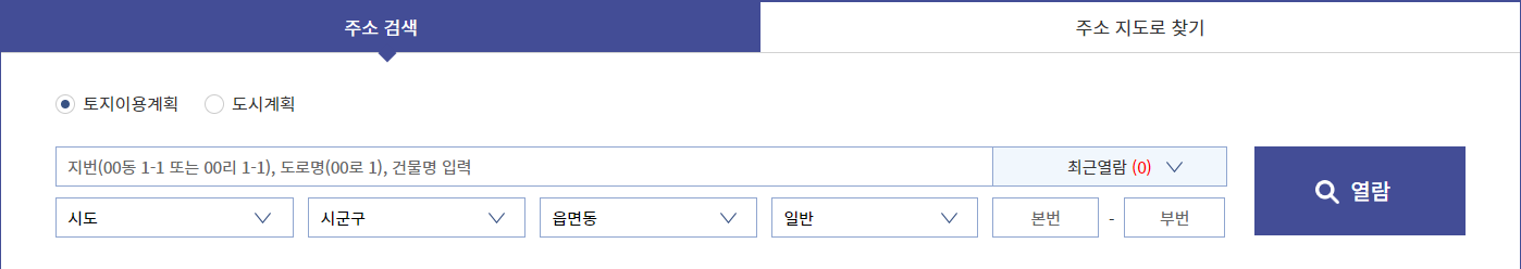 사이트에 접속한 후, 회원가입을 하고 로그인을 진행합니다. 로그인이 완료되면 검색창에 지번 또는 도로명 주소를 입력하여 해당 토지를 검색합니다.