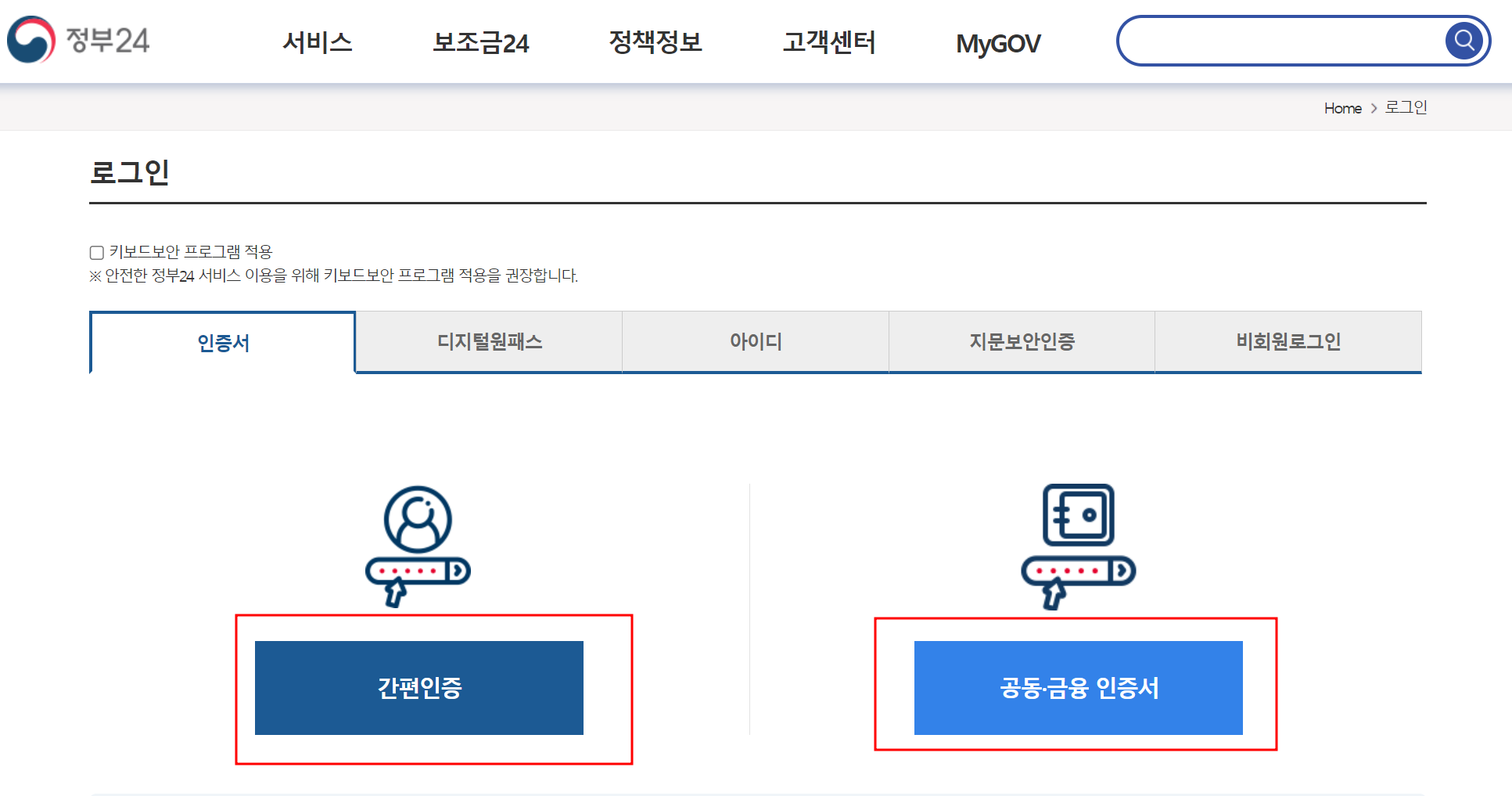먼저 회원으로 들어가보았습니다. 하지만 비회원으로 신청하더라도 일부 서비스는 간편인증 또는 인증서가 별도로 필요하니 준비해야 합니다.
